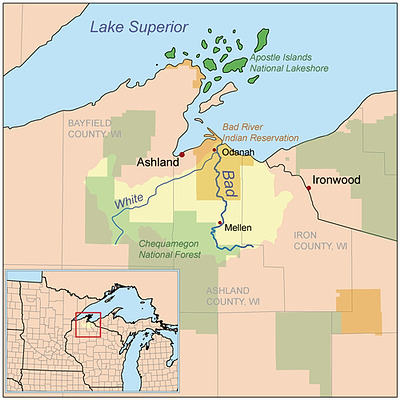 The Bad River is a river flowing to Lake Superior in northern Wisconsin in the United States. It flows for 119.6 kilometres (74.3 mi) in Ashland County, draining an area of 1,061 square miles (2,750 km2) in portions of Ashland, Bayfield and Iron counties. The Bad River sloughs were designated a Ramsar Wetland of International Importance on February 2, 2012.