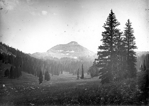 Headwaters of the Gallatin River, view south to Three Rivers Peak. Yellowstone National Park, Wyoming. ca. 1890. Joseph Paxson Iddings (USGS) photograph above.
