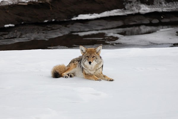 A coyote rests on ice on the Lamar River, A. Falgoust (NPS) photograph above.