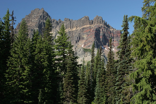 Three Fingered Jack, named for its distinctive shape, is a Pleistocene volcano in the Cascade Range of Oregon. It is a deeply glaciated shield volcano and consists mainly of basaltic andesite lava. Compared with other heavily glaciated volcanic peaks such as Mount Washington and Mount Thielsen, which display eroded volcanic necks as their cores, Three Fingered Jack's present summit is a narrow ridge of loose tephra supported by a dike only 10 feet (3.0 m) thick on a generally north–south axis. Radiating dikes and plugs from a series of overlapping cinder and composite cones that support this summit have been exposed by glaciation. The sole glacier is the unofficially-named Jack glacier, located in a shaded cirque on the northeast side at an unusually low altitude for the Oregon Cascades.…