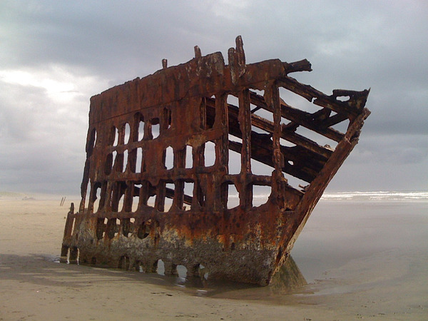 Peter Iredale was a four-masted steel barque sailing vessel that ran ashore October 25, 1906, on the Oregon coast en route to the Columbia River. She was abandoned on Clatsop Spit near Fort Stevens in Warrenton about four miles (6 km) south of the Columbia River channel. Wreckage is still visible, making it a popular tourist attraction as one of the most accessible shipwrecks of the Graveyard of the Pacific.