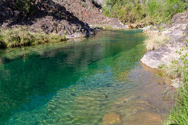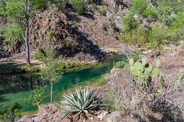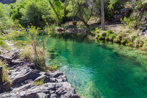 The Tonto Bench site at Fossil Creek Wild and Scenic River offers a deep swimming hole and shady creek banks to explore. Two short paths lead out of the parking area. The path to the left leads to shady, shallow pools and interesting water features. The righthand path leads straight out of the parking area to a deep pool. There are rock benches and walls all around the area, providing plenty of places to relax out of the water. A few sandy entries make it easy to get in and out of the water. Look for bits of history along the canyon wall above the creek where pilings from the old flume used to transport Fossil Creek's water to the Childs hydroelectric power plant before the Childs-Irving Hydroelectric Facilities were decommissioned and removed between 2005 and 2008. Increasing popularity has led to the Coconino and Tonto National Forests to implement a parking permit reservation system in 2016. As of 2017, permits are required April 1 to October 1. Visit Fossil Creek Wild and Scenic River for current information and to reserve a permit.
