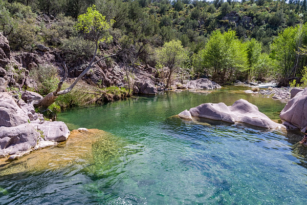 The Sally May site on Fossil Creek Wild and Scenic River offers some of the best swimming along the entire creek. There are two parking areas on either side of the bridge, which crosses Sally May Wash, on FR 502 (the Childs Power Road). Each lot has a path leading to separate pools along the creek. On the east (upstream) side of the bridge, the path leads to a large, deep pool at the base of a steep water feature. Rock shelves and cliff walls provide a lot of great spots for sunbathing and enjoying the canyon views. A smooth rock outcrop makes a great jumping-in spot. A small sandy beach at the far end of the pool offers shallow water entry and a good spot for smaller children to play. On the west (downstream) side of the bridge, there's a large open area above the parking lot that makes a great spot for a family picnic. The path to the creek leads to another swimming hole at the base of beautiful water feature. There are rocky banks to relax on, and a shallow sandy entry point not far downstream near a gravel-bottomed section of creek that is a great place to wade and splash. A bit of the creek's history remains along the banks here, structures from the days the Childs-Irving hydroelectric power plants used the creek to generate power for nearby mining communities like Jerome, Arizona.