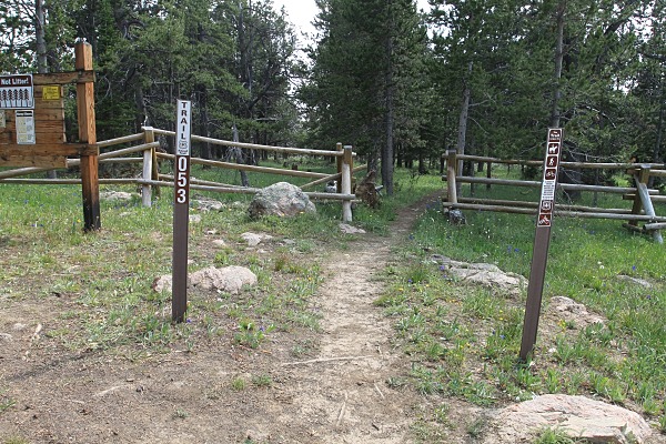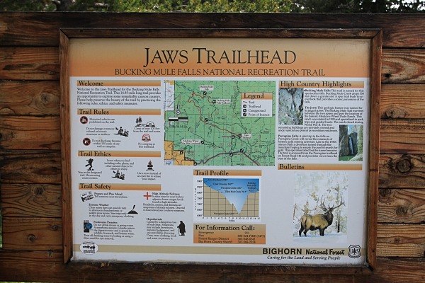 Trailhead on Porcupine Creek, Bald Mountain Creek on Bucking Mule Falls Trail in Bighorn NF, Rocky Mountains near Kane, WY