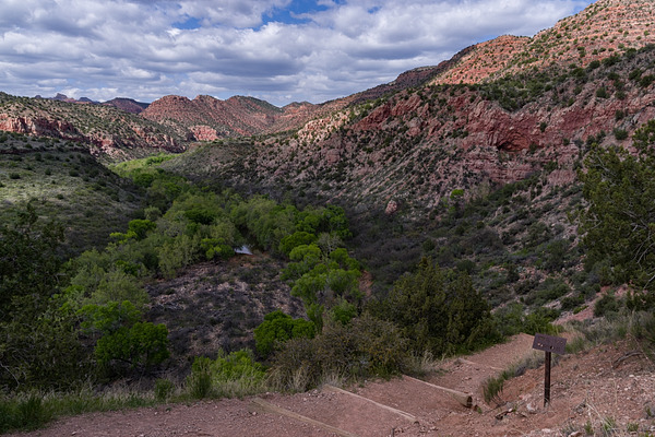 The hike up the Parsons Trail is a pleasant stroll along a cool, clear desert stream set in a magnificent red rock canyon. The trail leads through the lower reaches of this wilderness through a riparian area rich in plant and animal life. Songbirds flit through the tall cottonwoods and thick mesquite bosques. At a number of points additional springs flow from the canyon walls through gardens of columbine and watercress. Colorful cliffs that are a unique mix of dark columnar basalt, red sandstone, and buff colored limestone enclose the lush green of the oasis. The trail leads 4 miles to a large pool called Parson Springs where it surfaces from the underground course it has followed through the majority of the canyon. Up the canyon from the spring, water flow only occurs during snowmelt and after summer monsoons.