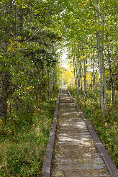 Shafthouse Trail passes through grassy plains and passes by an old Forest Service facility. From there, there’s a boardwalk through an aspen grove and the trail continues on to ultimately meet up with