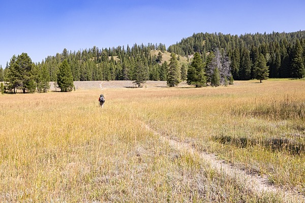 South Boundary Trail: hiker heading east near the South Entrance Trailhead, Jacob W. Frank (NPS) photograph above.