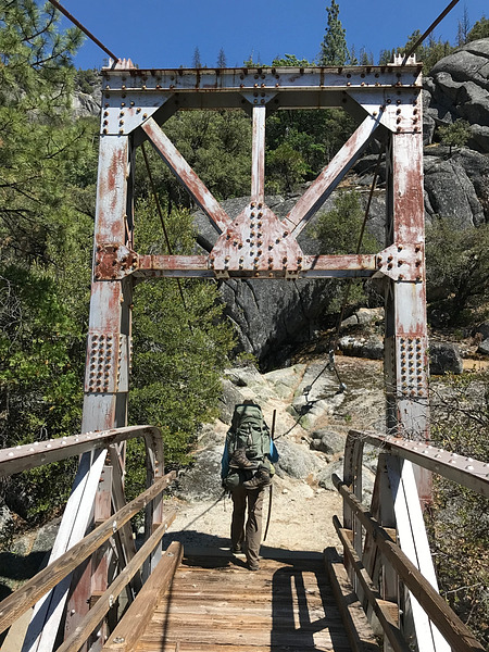 The trail starts at a trailhead with several areas for car camping with amazing views of granite domes. It descends down to Granite Creek and crosses over a stout bridge. Granite creek was the only water until the San Joaquin River in July 2018. After the Granite crossing, the trail slowly contours upward until it passes behind a dome visible from the trailhead. From here the trail drops down about 6 miles to the river. Trail was mostly in good condition, but it is easy to loose it at times due to a few large trees that have fallen, also because of a small forest fire scar, and some erosion due to little maintenance. Once down at the river, the trail crosses the San Joaquin River on another impressive trail bridge. Several great backpacking camping sites exist on both sides of the river near the bridge.