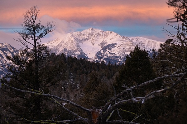 Crevice Creek Trail: first light on Electric Peak, Jacob W. Frank (NPS) photograph above.