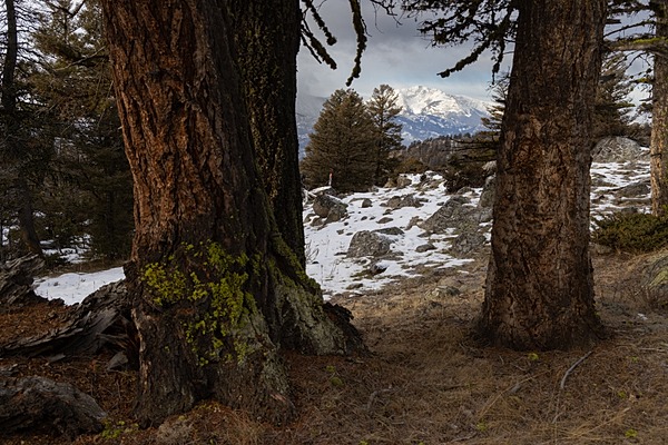 Crevice Creek Trail: Electric Peak through the trees, Jacob W. Frank (NPS) photograph above.