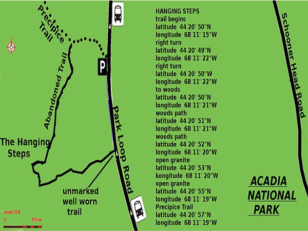 Rudolph Brunnow created the once famous Hanging steps by using iron rods to make it appear as it the large stone steps "Hung in mid air." So from the precipice parking area, walk down the side of the road moving in the direction as the traffic, along the right side of the road. Just up ahead be looking for a well worn but unmarked path entering the woods. This unmarked path is used today by rock climbers. You will come to a very large boulder with a sign in post with a log book, ignore if your not there to rock climb.