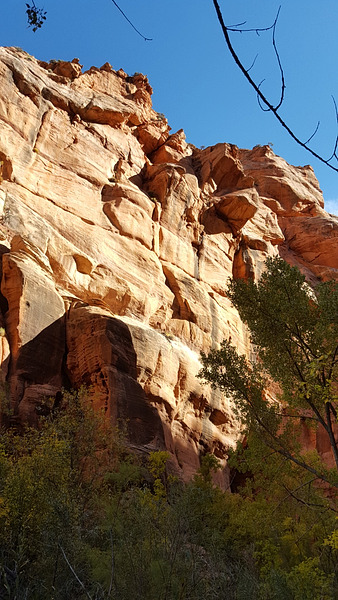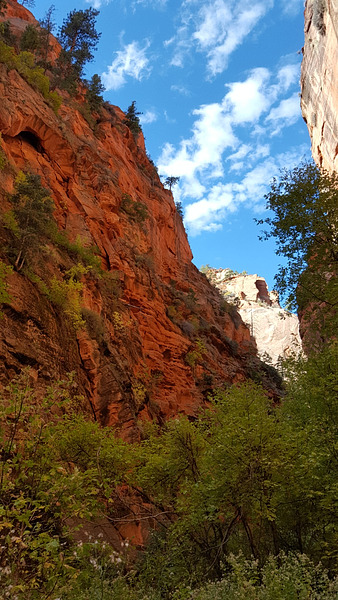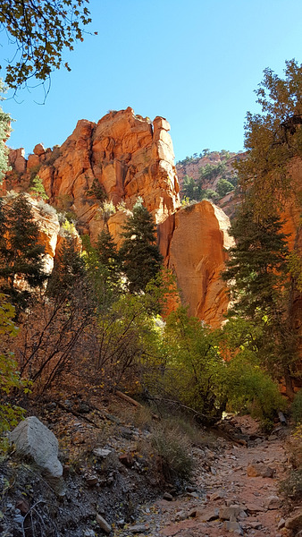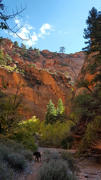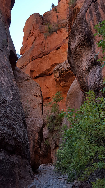 A nice hike to a fairly narrow red sandstone slot canyon with many side canyons. After 2.5 miles there is a choke stone which involves some scrambling and the canyon ends shortly after that. Each of the side canyons requires climbing over obstacles and none is very long. If you have the right equipment it is possible to climb out of the main canyon to the hills above and on into Zion National Park.