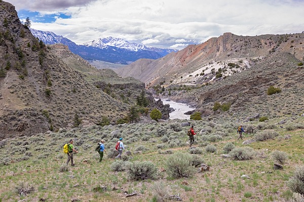Hikers and views of the Black Canyon of the Yellowstone River. Hikers are approaching the bridge over Bear Creek with Electric Peak on the distant skyline, Jacob W. Frank (NPS) photograph above.