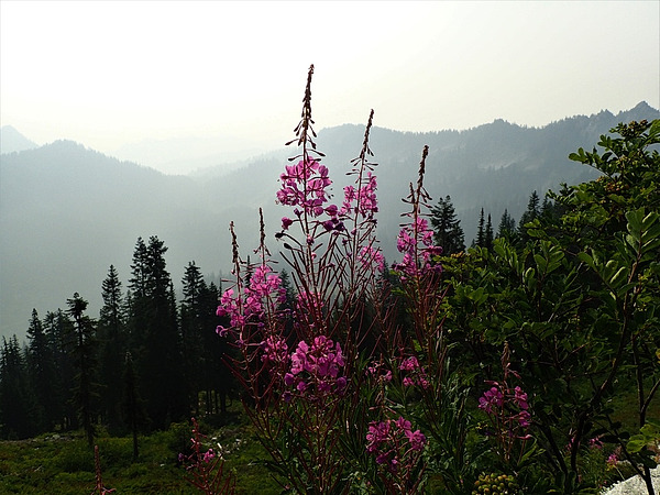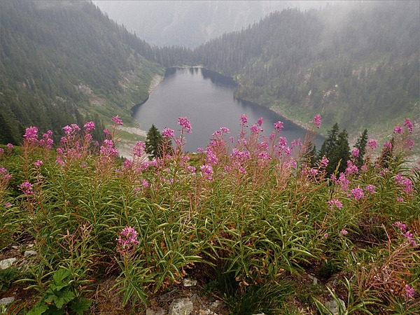 Descending the other side of the ridge, the trail continued through open brushy hillsides. Bright pops of hot pink fireweed beckoned us onward. We stopped for lunch and a well deserved break at Lake Susan Jane. A number of northbound hikers passing by stopped to chat.