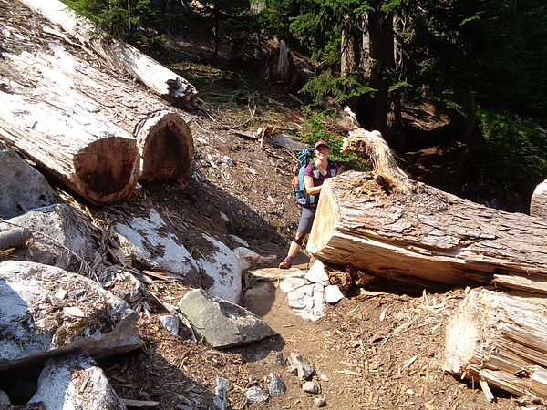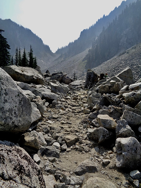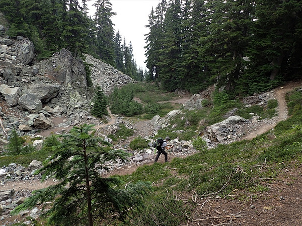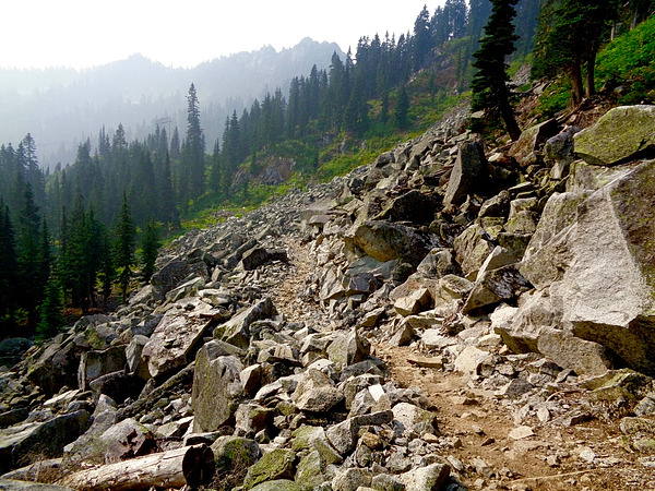 Steep switchbacks through dense forest dropped us far below the ridge followed by a nice section of level trail that traversed large open boulder fields. Sunlight twinkled on the surface of Surprise and Glacier Lakes below us, two more places that invited us to come back for a longer stay some day. Lunch and a break were on a side trail leading down to Glacier Lake.