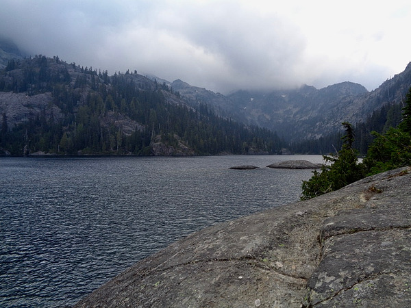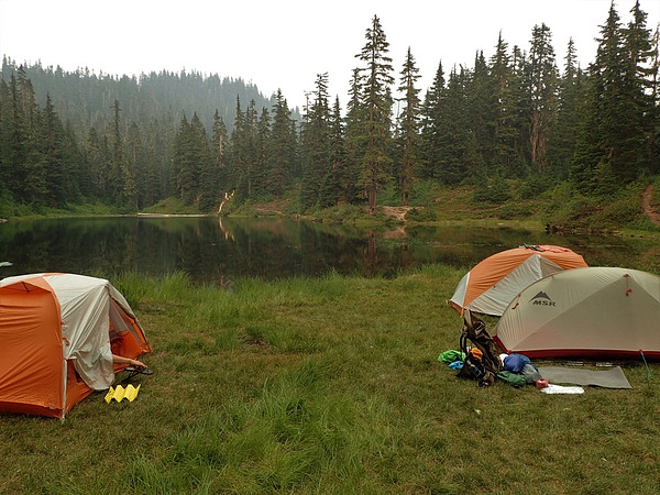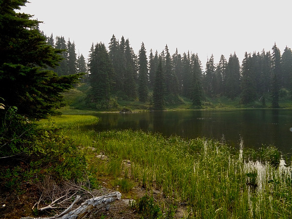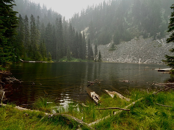 We stopped for lunch at a clearing and moved on as the rain began again. I was glad to have my Patagonia rain jacket and Sierra Designs rain pants. Both worked great.The next miles were our last climb of the trip, about 600 ft. up and around Alaska Mountain and above Alaska Lake, another beautiful gem, far far below. Finally, we arrived at Ridge Lake. A large group was camped there so we looked at a site right down on the water. It was small and had no grass, just dirt or today because it was raining, mud. It would have been a mess to camp there. After a bit more exploration we found a nice large campsite in a flat grassy area near the southeast end of the lake. Everything was enveloped in dripping wet clouds. The lake was nearby but the clouds were so thick we couldn’t see it until we were almost on it.