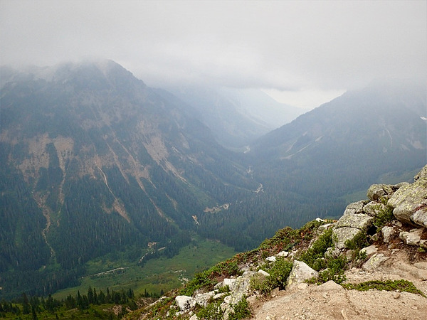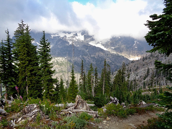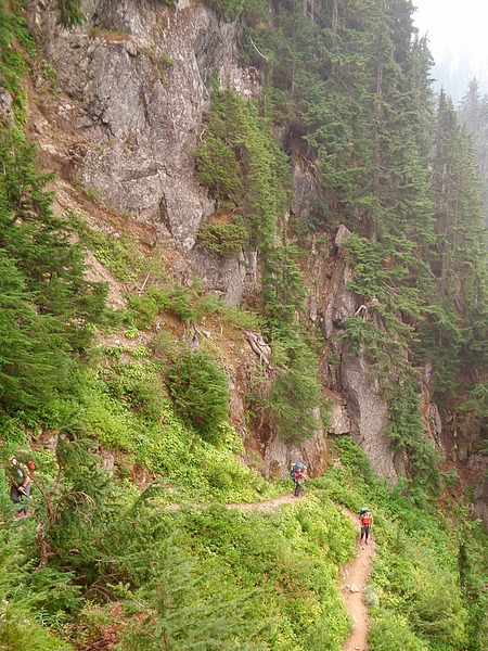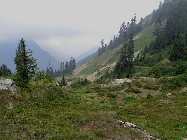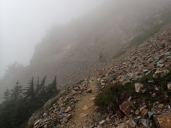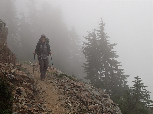 After the Kendall Katwalk the trail crossed to the western side of the ridge, and we began the long, long descent to the trailhead. The clouds started to lift and we had some short range views. At first we were hiking over a barren rocky slope brightened by fireweed. It must be stunning in clear weather. The clouds lowered again, the trail entered the forest and continued through trees for the remainder of the trip. As we hiked, we started encountering many hikers, some thru hikers but more day hikers.