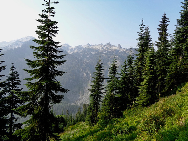So, I was relieved to have that over and looked forward to the next part of the trail. However, this was a 3+ mile, 1700 ft. climb to Cathedral Pass. It was now late morning and getting hot. I trudged through waist high shrubs that obscured the view of Hyas Lake. Nothing to do but soldier on. A hiker passing the other way told me to “just put one foot in front of the other.” Indeed. My companions waited for me at a campsite about halfway to the pass. I think they waited quite some time. I was really slow that day!! On we hiked to Cathedral Pass where we stopped for lunch and a long break in a lovely area with large open parks and views of peaks all around although we continued to have smokey skies.