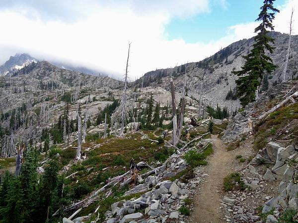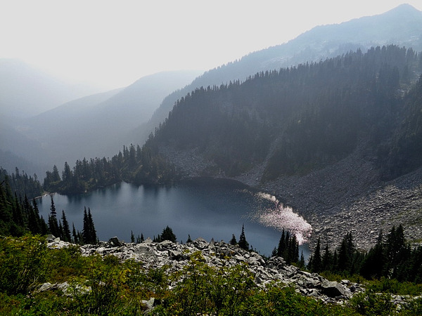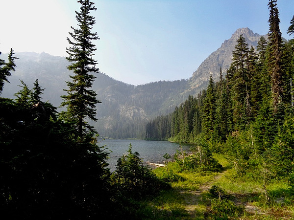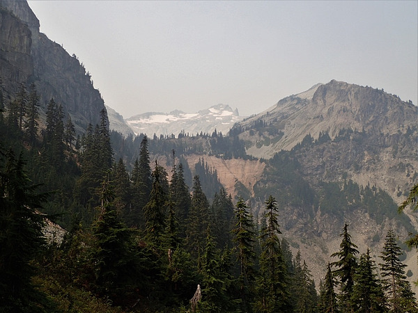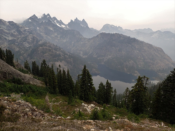 Eventually Trap Lake appeared below the trail, a sparkling jewel nestled below smokey jagged gray ridges. Views like this make it all worthwhile! Finally we reached the top of the pass above Trap Lake and stopped for a break before descending the other side. At the top, the air was clearer but the valley below was blanketed in smoke. We enjoyed visiting with several other hikers who were stopped for a break as well. Meeting and talking to other hikers was something I didn’t like at first. I thought it spoiled the wilderness experience, but over time, I’ve come to really enjoy all of the people on the trail. Everyone has a story, and we’ve met people from all over the world.