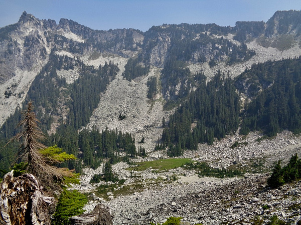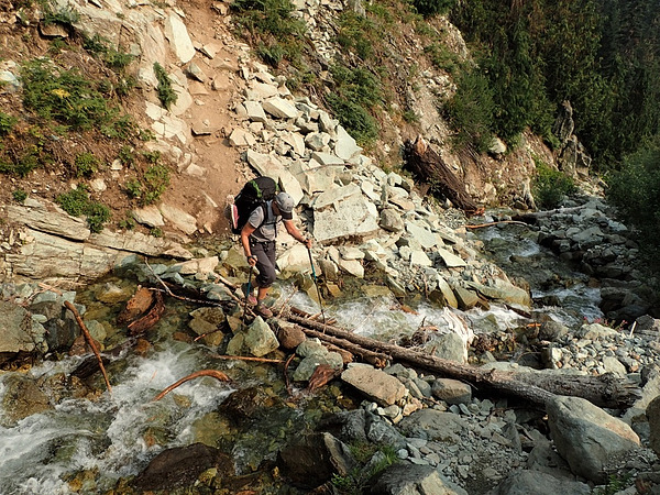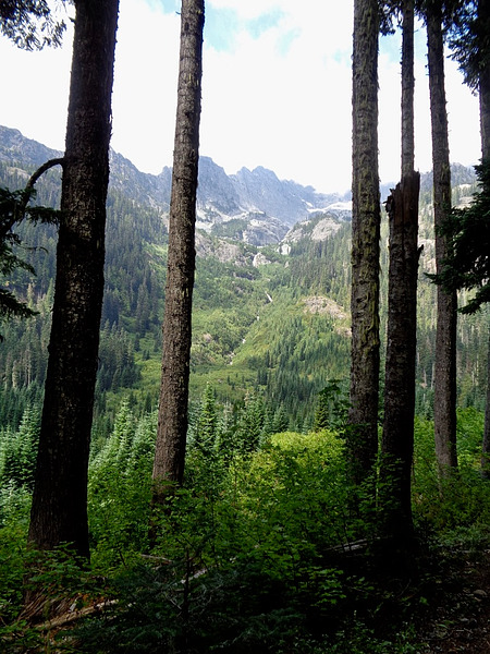 The trail switchbacked for 5 miles down from the ridge top. It was a very long descent of 2,200 feet but we continued to have great views across to the other side and the cascading water serenaded us the whole way. A forest fire had opened up views at the top but eventually we dropped into green forest. At the bottom of the drop the trail leveled out and was pleasantly flat for a few miles. A bridge carried us over a tributary of Lemah Creek, but the bridge for Lemah Creek itself had been destroyed so we had to cross it or cross on a log just downstream. My daughter and I chose the water crossing. Usually we just splash through water in our hiking shoes, but we changed into our camp shoes for this one. She went first and had no problem. I followed. My first step was on a rock that turned in the water. Down I went on one knee, banging my shin soundly on a large rock. I hopped up as fast as possible, wet to the thighs. Fortunately it was a very warm day so the dunking felt good.