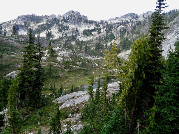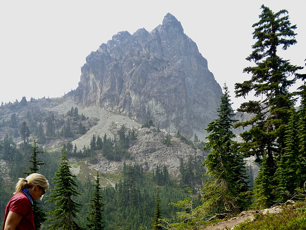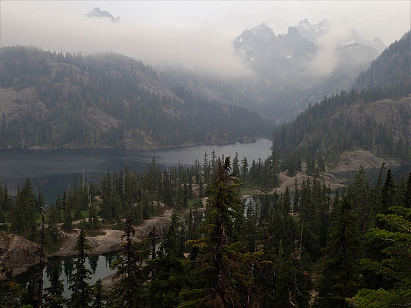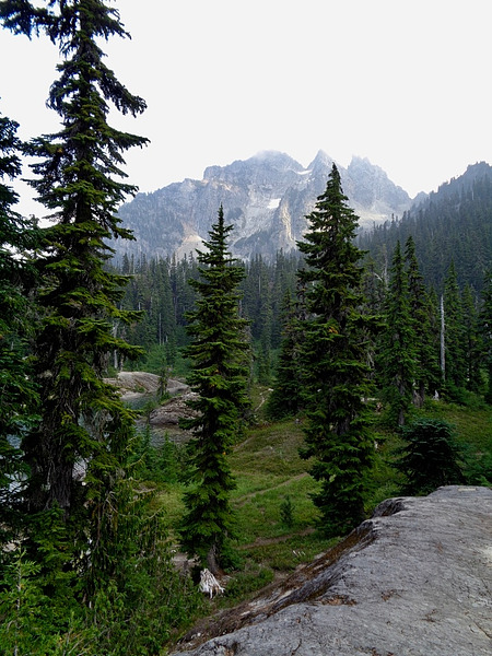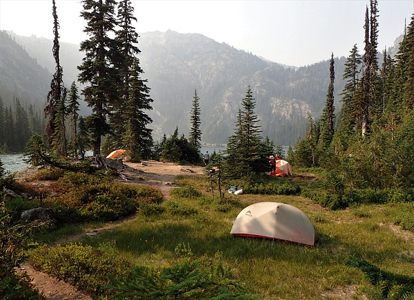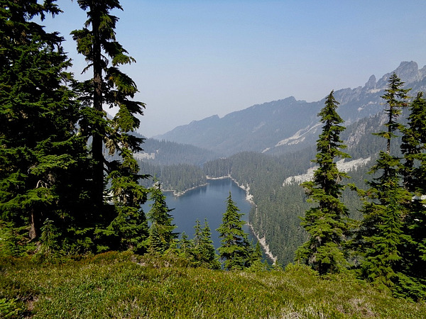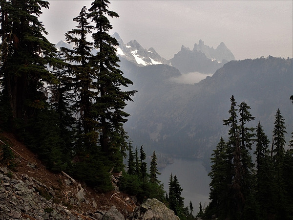 After three miles of switchbacks I came to a campsite. It was a small but beautiful site overlooking the lake and the towering peaks beyond. I tried to pick out where the trail we had walked but couldn’t figure it out beyond Waptus Lake. My companions were waiting there for me. We took a break, had a snack and took some pictures of this beautiful spot.