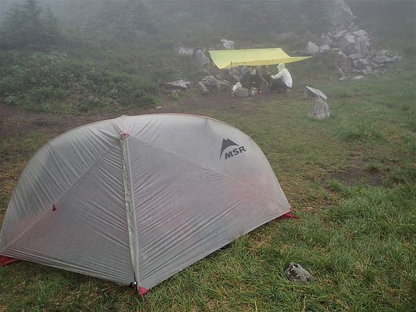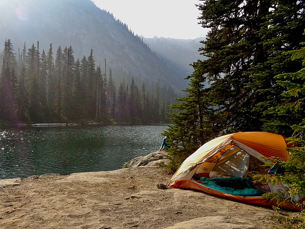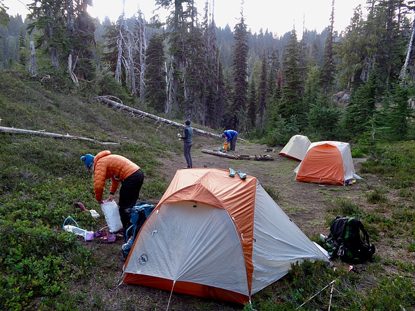 We quickly set up camp. Our rain tarp was assembled near some big rocks, so we at least had a somewhat dry place to sit and eat dinner. My daughter and I walked over to the lake to fill all of our water containers. It was early to bed this night- too wet and cold to stay up.