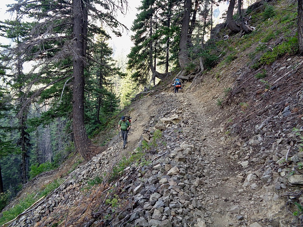 The morning was cool with heavy dew which made everything wet. We had our coffee, breakfast, packed up and were hiking at 7:00. I was ready before the others so took off a few minutes early since it had become clear that I was the slowest of the slow packers! They soon caught up to me on the 4 mile, 1400 ft steady climb through the forest to a pass above Trap Lake.