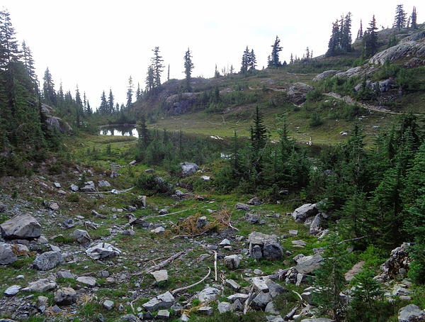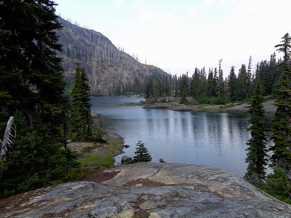 From Lake Susan Jane, the trail climbed a ridge to the east, giving us nice views of the lake. We then wandered for the rest of the day through dense forest, passing pretty Mig Lake and stopping to camp at Hope Lake where there were a number of tent sites. We chose a large patch of grass on the edge of the lake. Arriving mid-afternoon we had plenty of time to set up camp and rest. A family was nearby picking blueberries. They had day hiked up from the Tunnel Creek Trail. There was only one other person camped on the far side of Hope Lake that night.