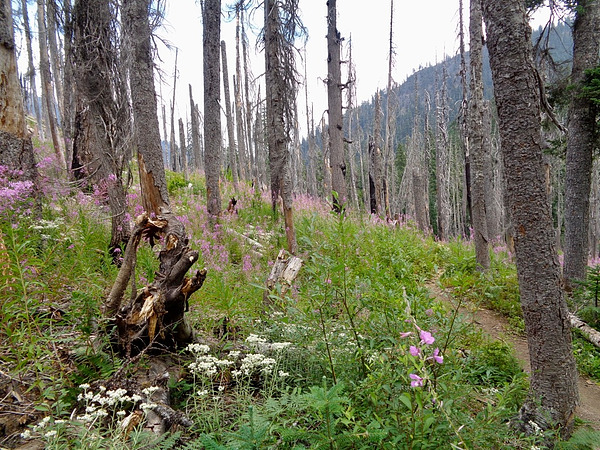 The afternoon was heating up as we started the climb to Spectacle Lake. The trail entered a burn area. Stark white and black trees blanketed the area. Large patches of fireweed added bright pink color as we climbed an open hillside with nice views looking east.