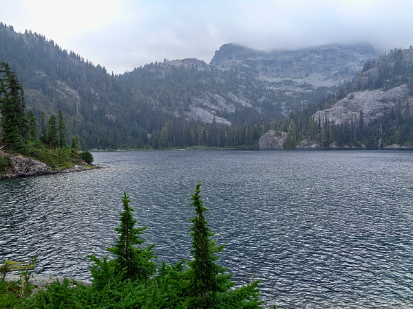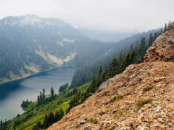Near the top of the ridge, I caught up to my brother and we rounded a bend that marked the end of our ascent. The guide books say the views from here are spectacular, including Mt. Rainier, but in the gloom, we couldn’t see the rocks ten feet in front of us let alone any mountains in the distance. The trail descended to traverse the side of Huckleberry Mountain above the beautiful waters of Joe Lake. The clouds had lifted some and the rain had stopped so we had some nice views of the lake and the Gold Creek Valley far below.