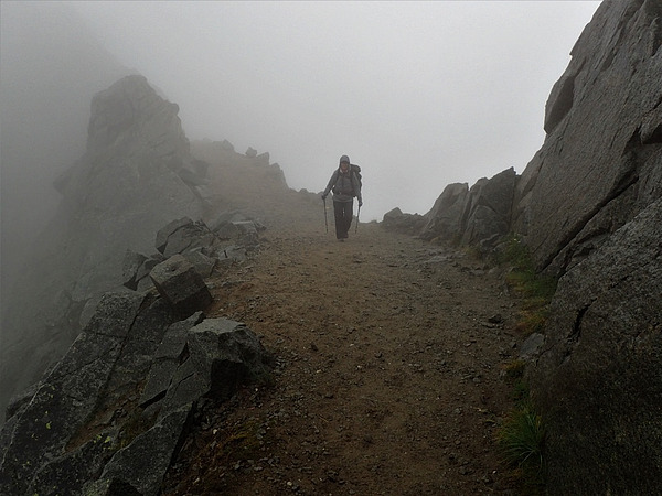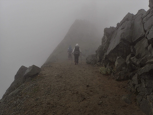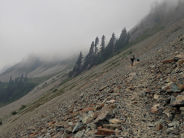 A short descent took us down to Park Lakes where we filled up on water for the remainder of the day and donned our rain gear as the drizzle began. Next up was the three mile ascent up gravelly Chikamin Ridge. The clouds lowered around us, and we really had no views of what must have been a spectacular valley below. In fact, we could barely see the ground in front of us. I could sometimes hear my brother somewhere in front of me as he click clacked through the rocks, but couldn’t see him. I thought I was in the Twilight Zone. The beginning of the ridge was covered in areas of large jumbled scree. The trail was indistinct and it was very hard to pick my way through the rubble. A twisted ankle here would not be a good thing. Fortunately, this section did not last too long. The rocks became smaller and easier to walk on as we gradually climbed up, up and up through the clouds.