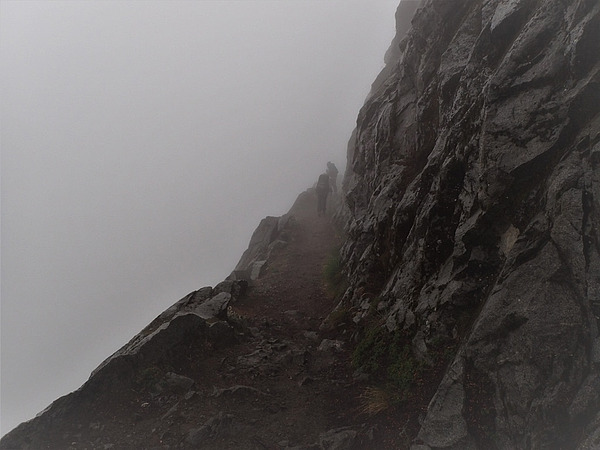 Soon we arrived at Kendall Katwalk, another section I had worried about. It is famous for being very narrow and dangerous with steep drop-offs. A low gray misty blanket covered the whole area, matching the grayness of the cliffs.The trail was actually comfortably wide, but I can’t attest to the drop off since I couldn’t see it.