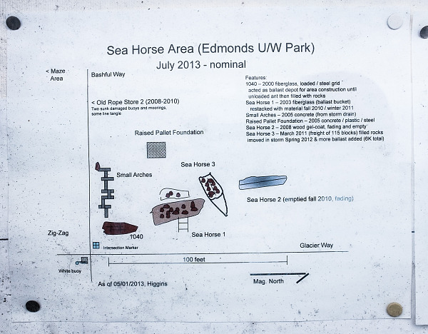 The Edmonds Underwater Park is located just north of the Edmonds-Kingston Ferry Landing at the foot of Main Street. The Park includes more than 27 acres of tide and bottom lands of which approximately half have been developed with features and trails specifically for divers.