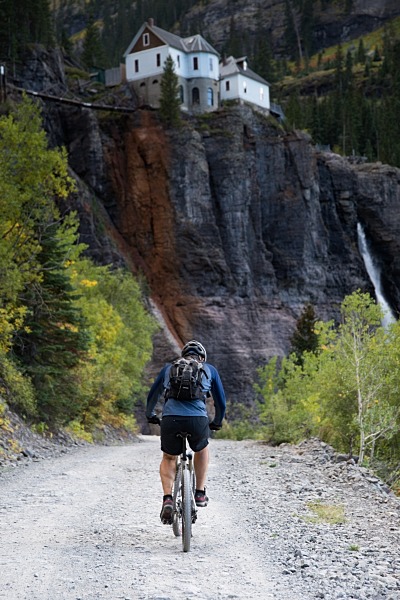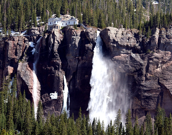 Bridal Veil Falls is a 365-foot (111 m) waterfall at the end of the box canyon overlooking Telluride, Colorado. Hiking and off-road trails pass by the falls and it has a hydroelectric power plant at its top. In winter the frozen shape of the falls forms an imposing challenge to intrepid ice climbers.