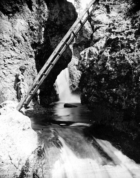 On our walk down the [Cascade] creek to the river, struck with the beauty of its cascades, we even neglected the greater, to admire the lesser wonders. Rushing with great celerity through a deep defile of lava and obsidian, worn into caverns and fissures, the stream, one-fourth of a mile from its debouchure, breaks into a continuous cascade of remarkable beauty, consisting of a fall of five feet, succeeded by another of fifteen into a grotto formed by proximate rocks imperfectly arching it, whence from a crystal pool of unfathomable depth at their base, it lingers as if half reluctant to continue its course, or as if to renew its power, and then glides gracefully over a descending, almost perpendicular, ledge, veiling the rocks for the distance of eighty feet. Mr. Hedges gave to this succession of cascades the name “Crystal fall.” It is very beautiful; but the broken and cavernous gorge through which it passes, worn into a thousand fantastic shapes, bearing along its margin the tracks of grizzly bears and lesser wild animals, scattered throughout with huge masses of obsidian and other volcanic matter – the whole suggestive of nothing earthly nor heavenly – received at our hands, and not inaptly as I conceive, the name of “The Devil’s Den.” - Langford 1905