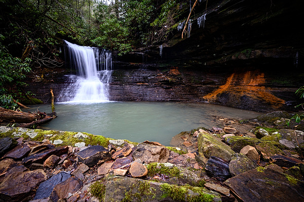 This waterfall is tucked away on a spur trail off the Honey Creek Loop. The catch pool is decorated with colorful rocks in the front and rust colored stains on the right.