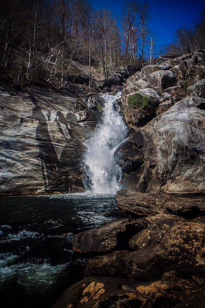 Windy Falls is one of the most rugged waterfalls in one of the most rugged areas of the Southeastern United States. Located on the Wild and Scenic Horsepasture River in North Carolina's Jocassee Gorges, Windy has attained a Cult reputation with Waterfallers wanting to hike to its elusive portions. The main drop of the waterfall is approximately 75 feet in height, and Bear Rock Falls immediately above Windy Falls and Terrifying Falls immediately below Windy Falls comprise what kayakers, hikers and waterfallers call one of the most rugged areas in the eastern United States.