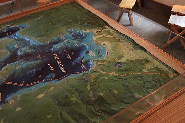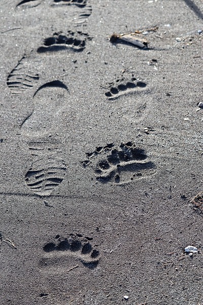 Grizzly bear tracks along the shore of Yellowstone Lake behind the Fishing Bridge Museum and Visitor Center, A. Falgoust (NPS) June 11, 2020 photograph above.