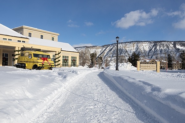 The Mammoth Hot Springs Hotel remains open throughout the winter. Reserve as early as you can. Nearby towns also offer lodging options. Mammoth Campground offers first-come, first-served sites if you are prepared for winter camping.