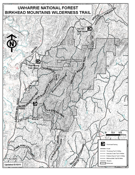 The Birkhead Mountains Wilderness was established by the 1984 North Carolina Wilderness Act, and it covers 5,160 acres (20.9 km2) in the Uwharrie National Forest at the northern end of the Uwharrie Mountains, in central North Carolina. The Wilderness Area's goals are to protect and preserve its natural resources and wilderness character and provide for public use.