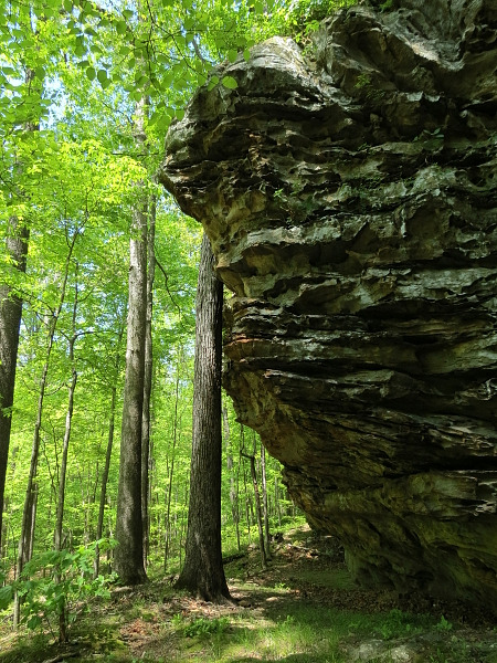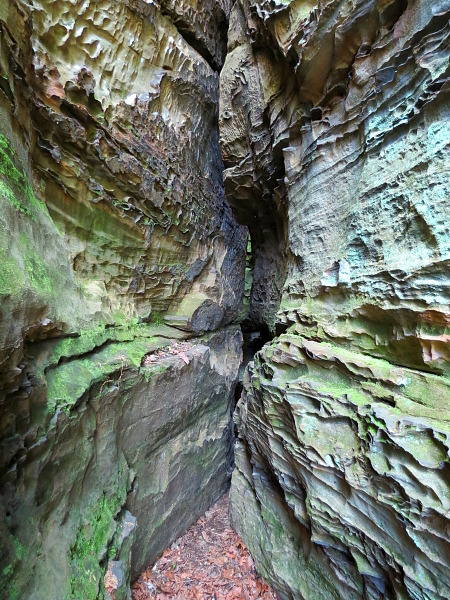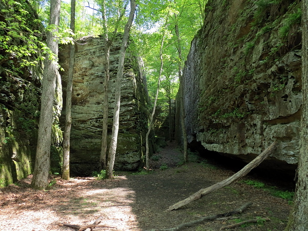 The fractured blocks of sandstone here resemble those at the more popular Giant City State Park. The massive sandstone layers of the Pennsylvanian Period Makanda formation overlie weaker rock. As the weaker layer fails, the sandstone above settles, fractures, and the blocks slide apart, creating the "streets and alleys".